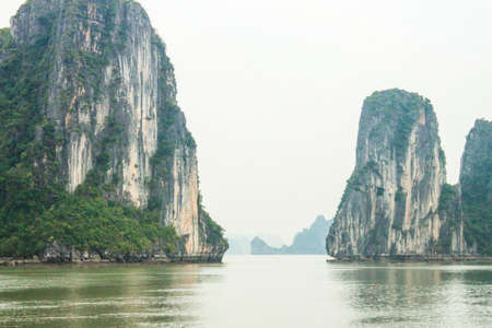 Halong Bay in mystical clouds. Mystical atmoshpere in the world famous halong bay. the limestone green rocks and the emerald green water gave a great contrast to the cloudy scene.