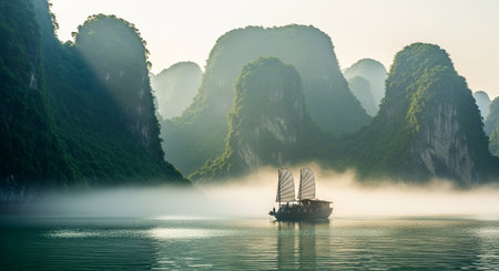 Sailing boat in the misty Halong bay, Vietnam.