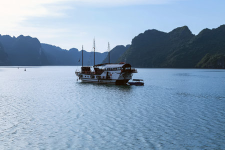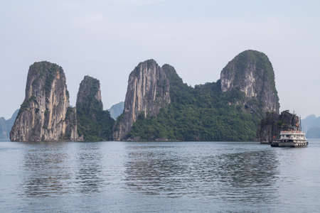 HALONG BAY, VIETNAM - CIRCA AUGUST 2015: Cruise ship and Rock formations in Halong Bay, Vietnam