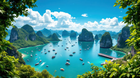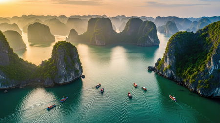 A stunning aerial view displays several boats sailing on turquoise waters surrounded by lush green rock formations. The composition captures the serene atmosphere under a colorful sky with shades of orange and blue. This image is suitable for travel, tourism, and environmental-themed projects.