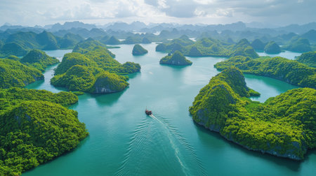 An aerial view captures the stunning landscape of Ha Long Bay, featuring verdant islands dotting the turquoise waters under a partly cloudy sky. A boat glides through the calm water.