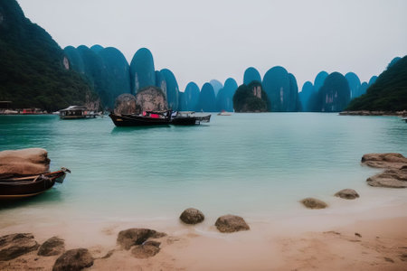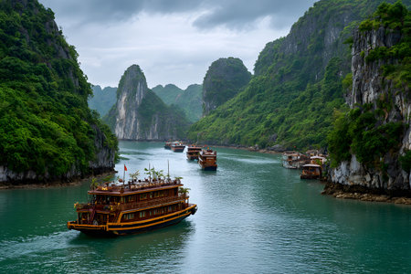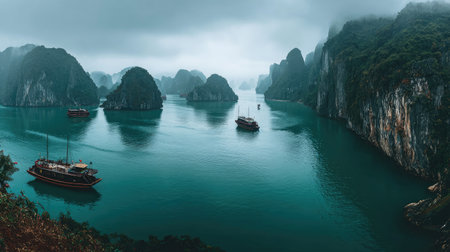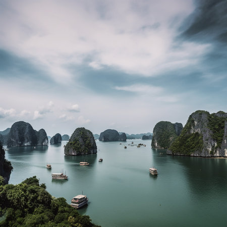 This image showcases a tranquil landscape featuring numerous limestone cliffs emerging from calm turquoise water. Several boats navigate the waters, enhancing the scene. The composition is wide, with a muted color palette under an overcast sky. This serene vista would be suitable for various editorial and commercial purposes.