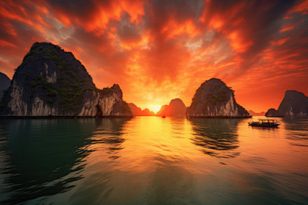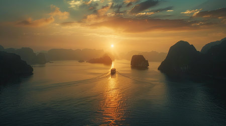 Beautiful sunset over Halong bay, Vietnam. Panoramic view, seascape sunset at Halong Bay, AI Generated