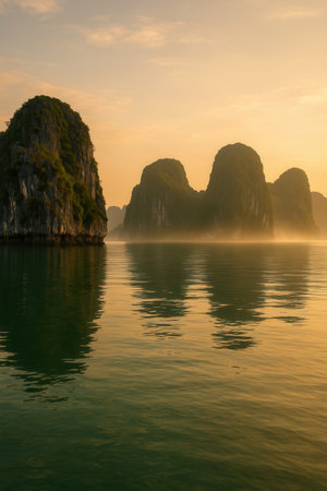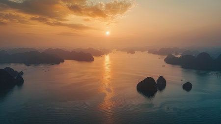 Serene sunset landscape at Halong Bay, Vietnam, captured from above with soft colors and peaceful waters