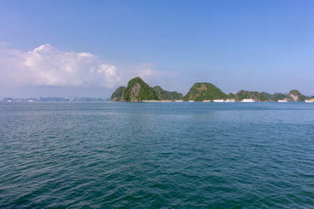 Seascape with towering limestone islands over emerald water with growing trees on it that view from cruising tourist boat in summer at Quang Ninh, Vietnam.