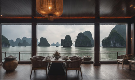 A dining room with a view of Ha Long Bay in Vietnam