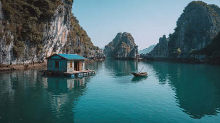 A boat floats near a small dwelling in calm, turquoise waters between towering rock formations under a clear sky. The image showcases a natural outdoor environment, likely during daytime, with soft lighting and a serene atmosphere. Potential uses include editorial illustrations or tourism promotions.