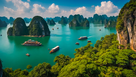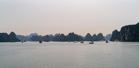 Panorama of Halong Bay in Vietnam with tourist boats