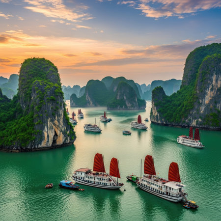Traditional Vietnamese boats float on the tranquil waters of Halong Bay under a captivating sunset behind limestone karsts.