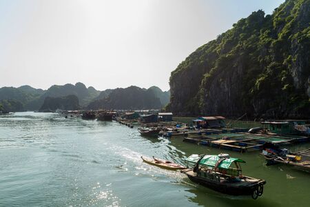 Beautiful landscape of Bai Tu Long Bay, taken during cruise to Quan Lan island, Vietnam. Pearl farming Seaside scenery photo taken in south east Asia, Ha Long