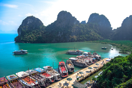 Boats taking tourists to see limestone karsts and isles in Ha Long Bay, a very popular travel destination in Quang Ninh Province, northeast Vietnam