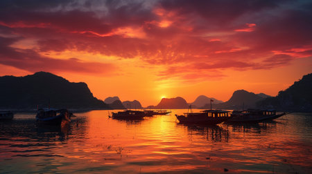 Experience the tranquility of a stunning sunset over Ha Long Bay, with boats gently gliding on the water and silhouetted islands reflecting the vibrant colors of the sky.