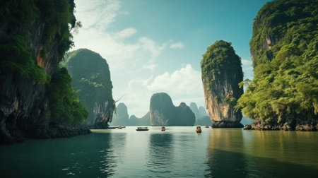 Tropical island in Ha Long bay Vietnam Asia Amazed nature scenic landscape of James Bond Island with a boat for a traveler in Phang Nga Bay, Ai generated