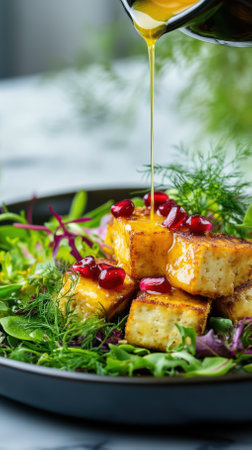 Chef pouring a honey mustard vinaigrette over a vibrant salad featuring pan fried tofu, juicy pomegranate seeds, and a mix of fresh, organic greens, creating a deliciously colorful dish
