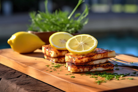 grilled halloumi on cedar plank with lemon wedges, created with generative ai