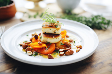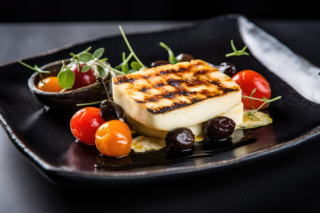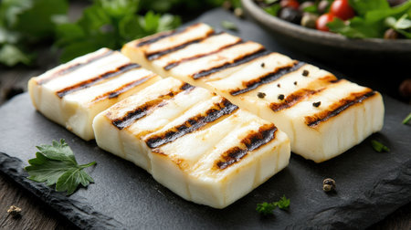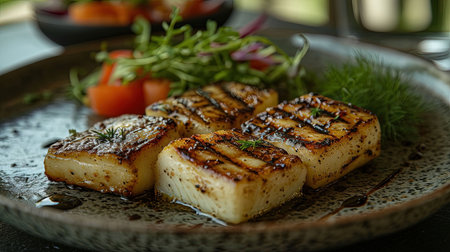 finished cedar plank grilled halloumi served on plate, created with generative ai