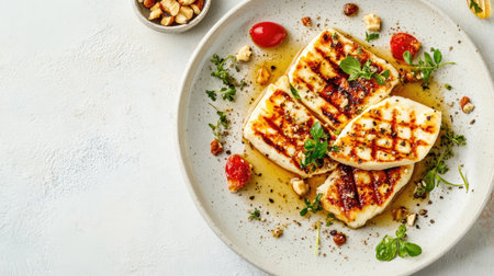 Grilled Halloumi Cheese on a plate with herbs. Top view. Copy space