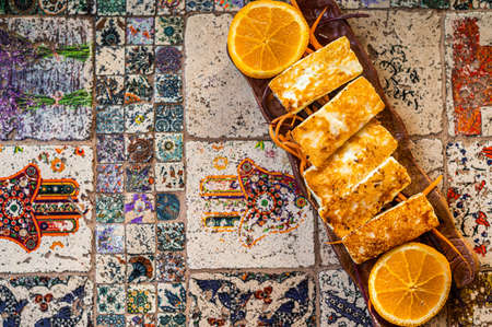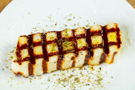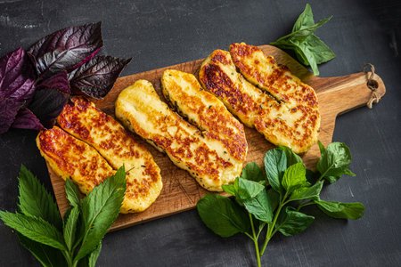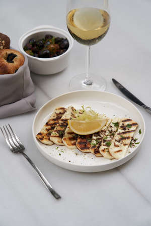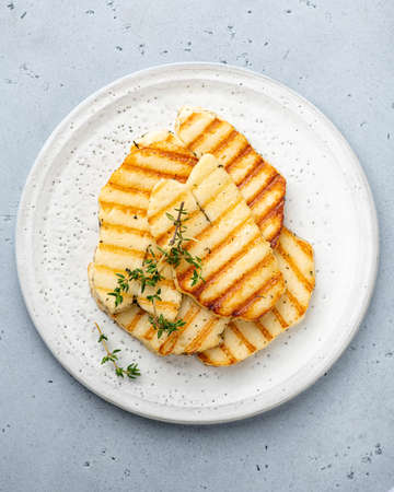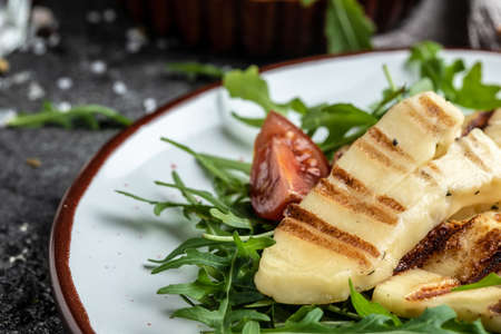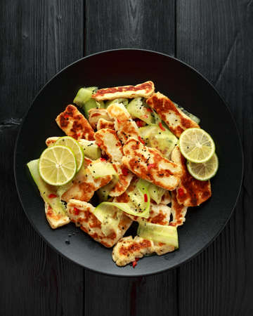 Grilled Halloumi cheese, Cyprus squeaky cheese, Restaurant menu, dieting, cookbook recipe top view,