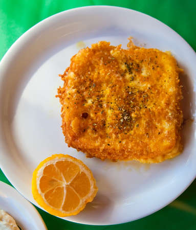 saganaki - fried cheese served with lemon, traditional greek appetizer