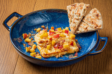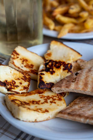 Traditional roasted or grilled halloumi cheese from Cyprus served hot with flat greek bread