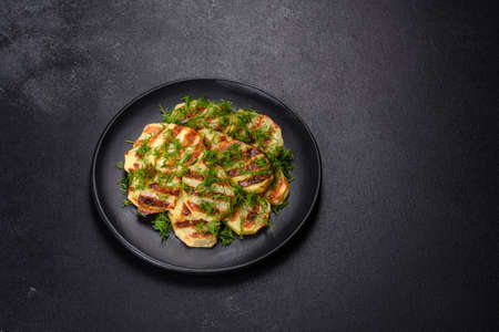 Delicious grilled potato slices with spices and herbs on a black plate against a dark concrete background. Cooking at home