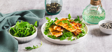 Warm salad with grilled halloumi and arugula on a plate on the table web banner