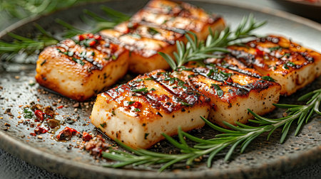 Enjoy a beautifully plated grilled tofu dish with fresh mint and sesame on a rustic wooden platter, perfect for healthy dining and gourmet presentations.