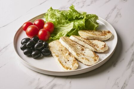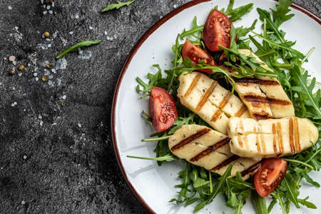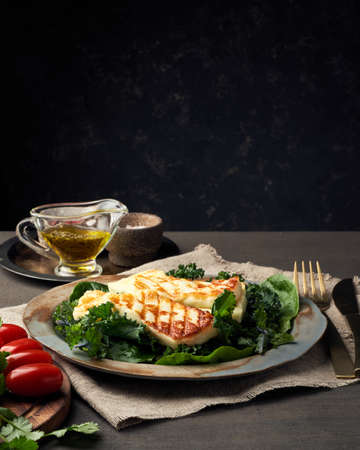 Grilled Halloumi, fried cheese with lettuce salad. Balanced diet, white plate on dark background