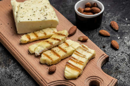 Grilled Halloumi cheese with mint and almonds on a wooden board, Cyprus squeaky cheese,