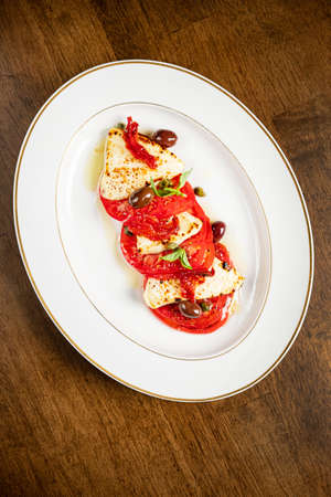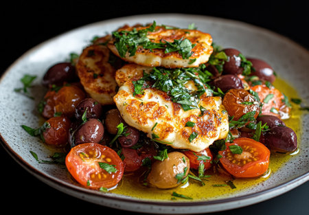 Grilled halloumi cheese with tomatoes and olives drizzled with oil.