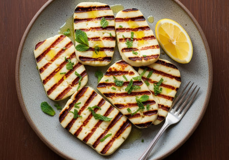 Delicious grilled halloumi cheese, known for its unique texture. It is served with fresh mint, lemon, and olive oil on a rustic plate for a healthy appetizer.
