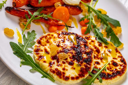 close-up of grilled baby carrot salad with sherry vinaigrette, pickled raisins, parisienne carrots, arugula and grilled halloumi cheese on plate on white wooden table, horizontal view from above