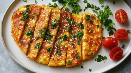 Korean Gyeran Mari omelette slices on a white platter, garnished with fresh herbs and a sprinkle of sesame seeds, shot from above for a banner-sized presentation