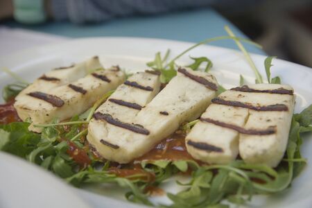 Three roasted slices of Greek Halloumi cheese, a semi-hard, unripened, brined cheese, made from a mixture of goat's and sheep's milk. Served in a plate with a salad, Thessaloniki, Greece
