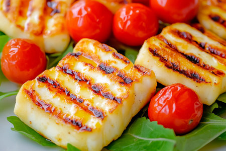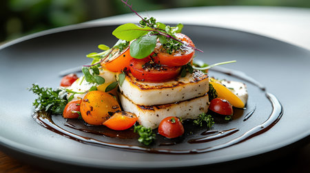Savor the delight of perfectly grilled cheese squares paired with juicy roasted tomatoes. This colorful dish is artistically arranged on a bed of fresh greens, celebrating summer's bounty.