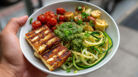 A person is holding a white bowl with a variety of food items, including zucchini, tomatoes, and cheese. The dish appears to be a healthy and colorful meal, with a mix of vegetables and protein