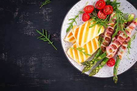 Grilled halloumi cheese salad with tomatoes and asparagus in strips of bacon on plate on dark background. Healthy food. Top view, above