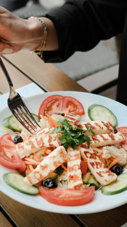 Grilled halloumi cheese salad with tomatoes and olives.