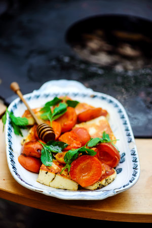 Halloumi cheese with apricots on an outdoor grill.selective focus