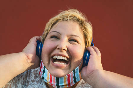 Plus size woman listening to music playlist with wireless headphones outdoor - Overweight confident girl lifestyle concept - Red background