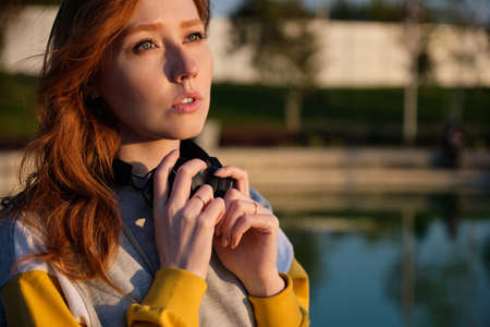 Close-up portrait of a red-haired girl with green eyes holding her hands on headphones and looking up