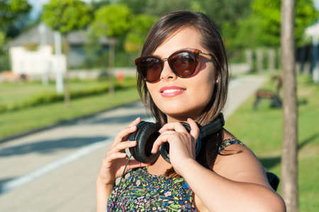 Attractive lady holding her headphones outside in park and smiling with copy text space