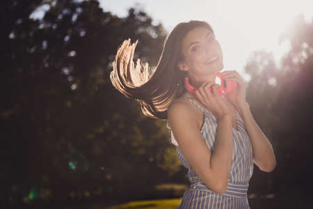 Portrait of attractive cute cheerful girl listening music going on fresh air spending holiday free time hair flying outdoors