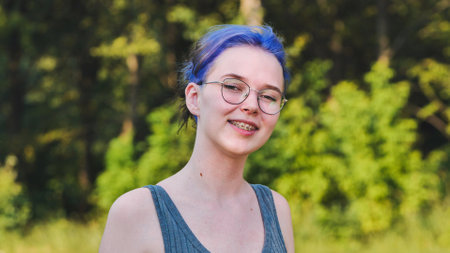 Smiling school student with blue hair, glasses, and braces posing in a natural outdoor setting