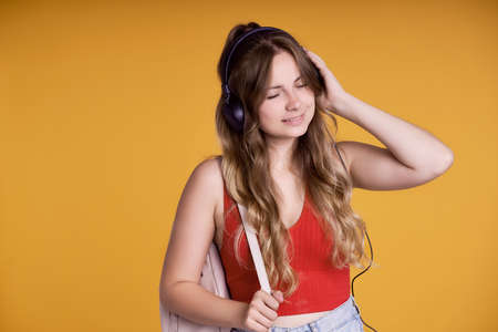 Caucasian female student listening music at yellow background