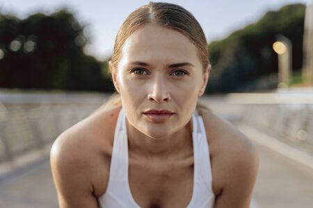 Young fitness attractive sporty girl resting after intensive evening run outdoor at sunset in city
