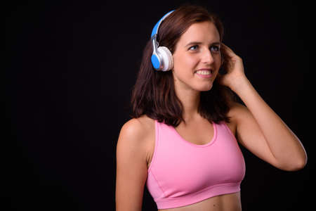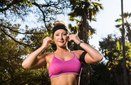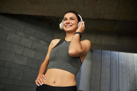 Portrait of happy young beautiful woman listening to music and ready for gym