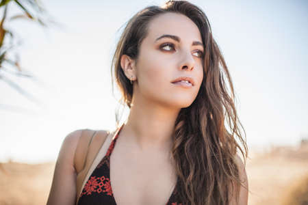 Beautiful young woman near sea on sunny day in summer, space for text