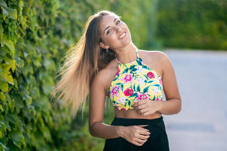 Young girl moving her hair near a leaves background outdoors