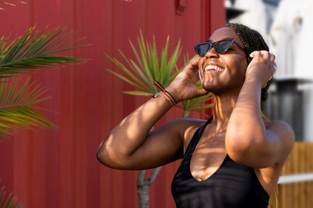 Portrait of cheerful young African American girl in sunglasses listening to music on headphones, on red wall background with palm trees.